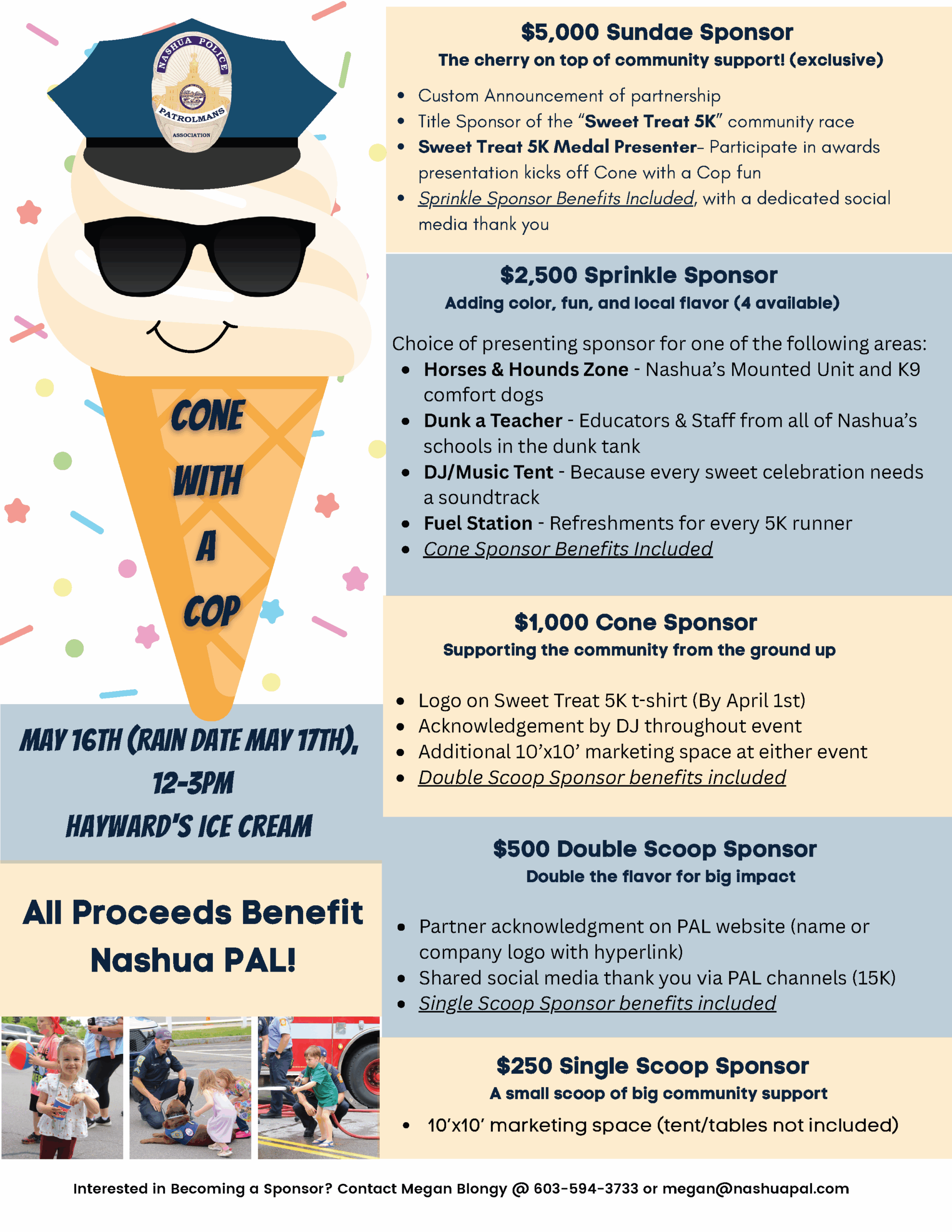 This year, we’re kicking things off with the brand-new Sweet Treat 5K, a fun community run that finishes right across from Hayward’s Ice Cream, leading directly into the Cone with a Cop event.